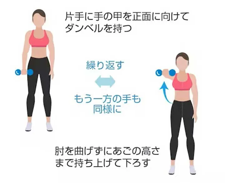 - 両手を肩に向かって二頭筋を意識すながら、しっかりと持ち上げます。下げの動きは、 肘の位置を固定したまま、三頭筋を意識しながらゆっくりと振り下ろします。