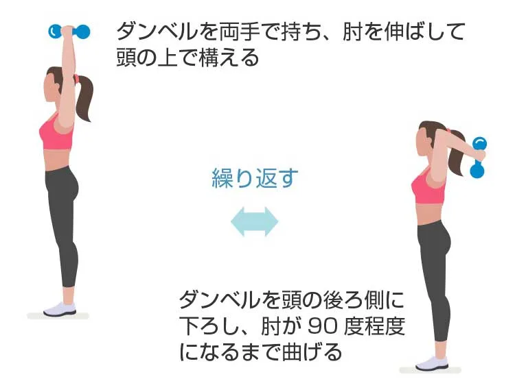 方法: ダンベル(または重めのボトル)を両手で持ち、頭の後ろ、背中側まで深くセットします。